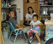 これはバイクいじりスペースでの一枚です。棚をたくさん取り付けました。土間スペースはご主人の趣味の部屋ですが、キャンプいすを出して、娘さんの遊び場にもなっているそうです。奥様は玄関から腰をかけてニッコリ。