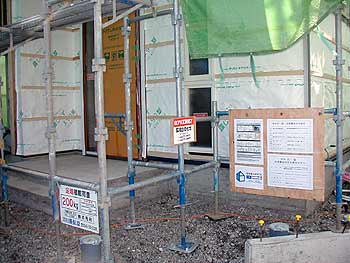 断熱玄関ドアはトステム「フォラード」を採用。断熱性・気密性・遮音性に優れた高性能ドアです。「長期優良住宅認定」「長期優良住宅先導モデル」「CASBEE評価」「住宅省エネラベル」の看板を設置しました。