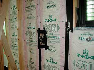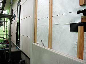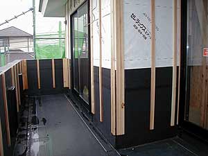![]() 外壁には軽量気泡コンクリート製のパワーボードを張り込みます。透湿防水シートと外壁間との通気層は18mmを確保します。 |