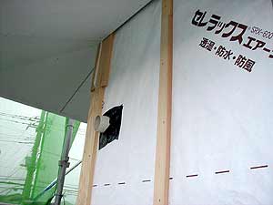 ![]() 壁を貫通する部材にも十分な気密処理を行います。軒裏へ抜ける外壁通気層も重要な施工ポイントです。 |