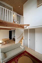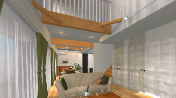 吹き抜けのリビング、天井までのドア(フルハイドア)、