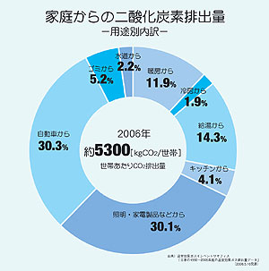 環境省は、国民1人が家庭で排出するCO2の量を1日6kgと算出しています。京都議定書の削減目標を達成するため、「1人1日CO2を1kg減らそう」と呼びかけています。つまり「1人1日10ポコ」を目標に、ということです。誰かがではなく、皆で少しずつ工夫してCO2の排出量を削減したいものです。更に、こうした生活での工夫とは別に建物本体の性能を上げてCO2排出量を減らすという方法もあります。