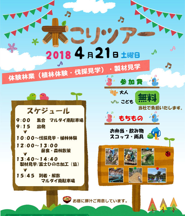 ※予約される方は、木こりツアー予約フォームから予約いただくか,電話・FAXにてお申し込みください。