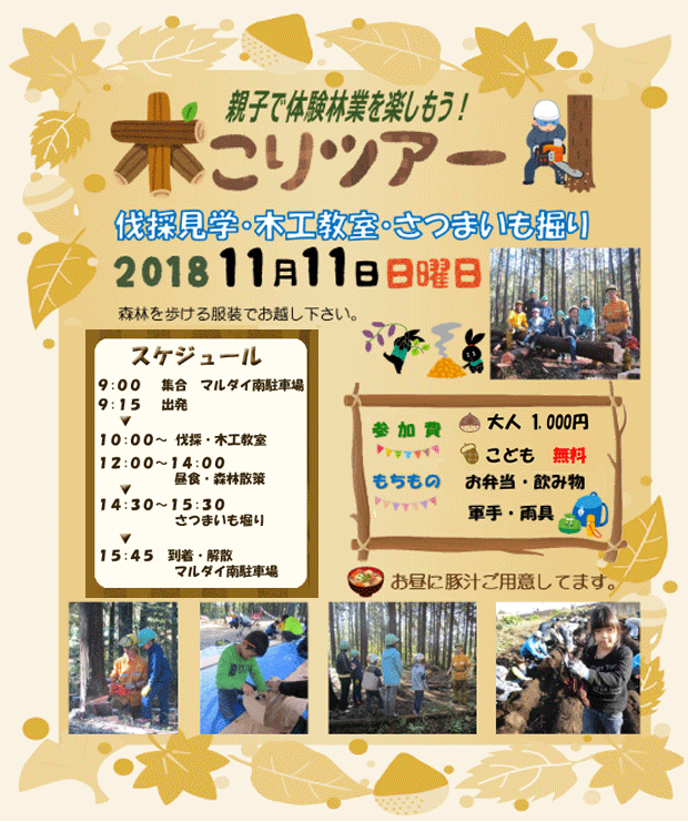 ※予約される方は、木こりツアー予約フォームから予約いただくか,電話・FAXにてお申し込みください。