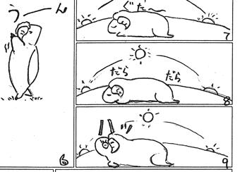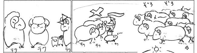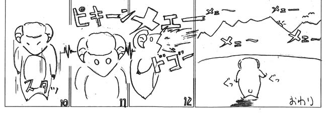 「100話・・・8年と4ケ月・・・りゅうげん先生、本当にお疲れ様でした。メェメェメェが何となく葛飾柴又の“とらさん”に見える・・・。第一話を載せてみました。「ぷっ!」と私も吹き出しそうになっちゃいました(笑) 私が言うのも何ですが、せんせ!ものすごく上達してますよね。すんばらしい~♪前にも書きましたが、セリフがほとんどなくて、全てを「メェ~」とか「ピキ~ン」とか「ドゴ~ン」とかで表現してましたので、せんせも大変だったと思います。メェメェメェ、色んな所に行きましたねぇ、シュールな世界もたくさん見せてもらいました。もう会えなくなるのかと思うと寂しくて・・・何か涙が出そう(T_T)又会いたいよ~。」 by小川