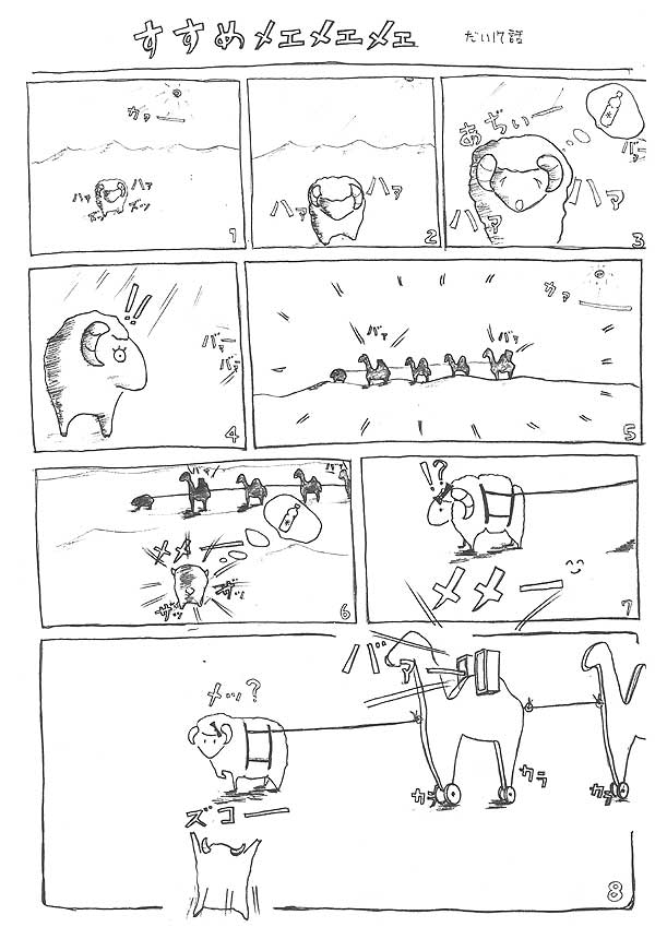 メエメエメエ、5月号で”こいのぼり”から出て、今度は「砂漠」を旅?意味わかんな~い・・・って?そこがメエメエメエのいいところ。だって、読み終わった後、絶対にみなさんの頭の中を、「バア~」と「カラ・カラ・カラ」が、ぐるぐる回りますから!