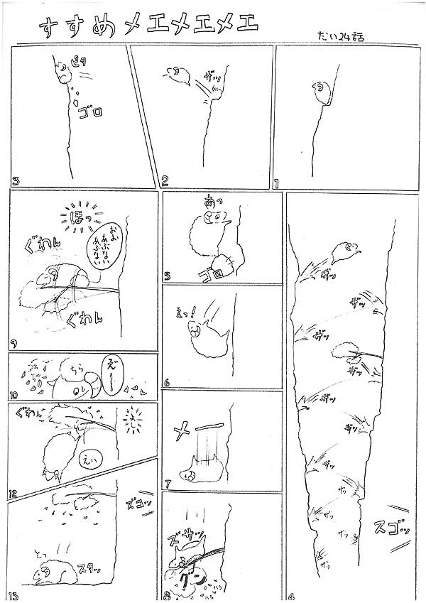 | 「危険な絶壁を、華麗にジャンピングして登って行くメエメエメエは、まるでヒマラヤ山脈に生息するヤギのよう。だけど、時々うさぎの「おはぎ」に似ているメエメエメエになってると思うのは私だけ? 今回のポイントは、『スゴッ!』と『ズコッ!』ですよね!?。そういえば去年のクリスマスパーティーで友達が「赤鼻のトナカイ」の替え歌で「赤恥の腹かい」という、自分の三段腹を歌詞にしてきて歌ってました。♪痩せちゃダメダメ~そのままでぇ~、お前の腹が役に立つのよ~♪ もちろん私もトナカイの着ぐるみで一緒に横で踊りましたが・・・あれっ!何でこんな話になっちゃった?(^_^;)」 by小川