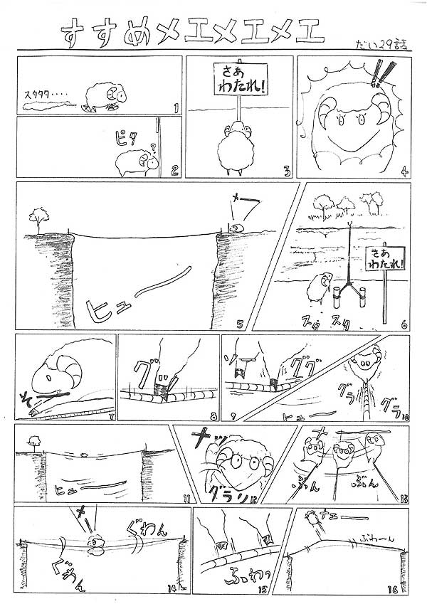 『今日もテクテク歩いていると、何やら立て看板に当たった。(毎度おなじみ、周りが見えていないメエメエメエ)見るとそこには、「さあ、わたれ!」の文字(普通「わたるな!」だろう・・・(-_-;) さらにその先には深い崖に一本のロープ。え~本当に渡るのか!!メエメエメエ!果敢に挑むメエメエメエ!! するとやはり途中でバランスを崩して(というか、真ん中まで進めたのはすごい!)ロープに放り投げられて・・・あとはいつもの落ちですいませんm(__)m』 byりゅうげん