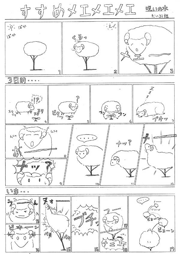 『ある晴れた秋の日、1本の木・・・じゃなくてメエメエメエ、えっ?!何で・・・。それは3日前の事、いつものように歩いていると、そこに1本の芽を発見!「何だこれ?」食えるものではないとわかると「知~らない」っと、その上に寝てしまうメエメエメエ(ヒドイ!)数時間後、昼寝から目覚めると、アレ?アレ~!木が体にくっついてしまっているではありませんか。何とメエメエメエが乗っていしまったのは恐ろしい恐ろしい”呪いの木”なのでした。ヒエ~~、どうしよう~何とか離れてくれ~!必死でもがくメエメエメエ。その時「ピキーン」いつもの?覚醒がキター!!未知の力で引き離そうとするメエメエメエ、その時、ブチッ!「やった~取れた~」と思ったら、ただ幹が折れただけでした。でも動けるようになって去って行くメエメエメエ。ああ、とりあえずそれでいいんだ・・・えっ、それでいいの? 余談ですが、今回からタイトルがつけられるようになりおました。』 byりゅうげん
