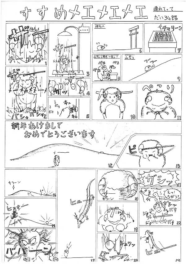 『清めの儀式?修行?と思いきや、単にシャワーを浴びているだけでした。まぎらわしい。 お正月、神社へ行き初日の出を拝むメエメエメエ。 そこで、昔からの友達の龍を呼ぶのであった。 龍の背中で空の散歩を決め込もうとしたが、龍にわしづかみにされつれて行かれてしまいました。』 byりゅうげん