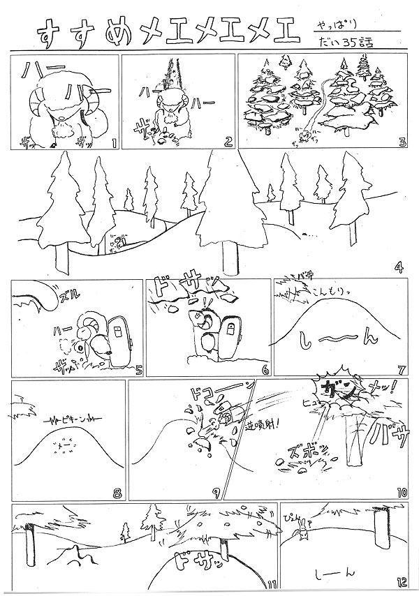 「いやっ、せんせっ!!5コマ目まで見なくても『オチ』は最初からわかってますから(笑)9コマ目のメエメエメエがどうしても雪山に突っ込んでいくように見えちゃって、「んっ??ああ・・・逆噴射!ね・・・」とぶつぶつ一人で言ってたら、先生いわく、そこが一番受けるところなんだとか(汗)。私的には、4コマ目のウサギの”おはぎちゃん”が後ろからしっかりついてきてるところとか、逆噴射のリュックの一いい感じ♪とかメエメエメエが飛び出した後の雪山の形とかにピキ~ンときちゃうんですけど(^_^)v 」 by小川