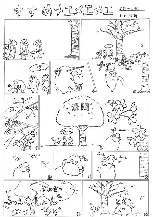 『イナズマ・リボン・メの3人、久しぶりに花見に来たのだけれど、まだ桜は咲いていませんでした。がっかりする2人をよそにそれを予想していたメエメエメエは、おもむろに背負っていた箱の中から「秘密の灰」を取り出しぶちまける、あら不思議♪桜の花が咲き満開になったではありませんか。しばらくうっとりする3人。するとそこに、ひとひらの花びらがメエメエメエの鼻の上へ落ちあまりのムズムズ&花粉症で爆くしゃみを発射!せっかくの花びらがみんな散ってしまいました。花の命は短いというお話でした。』 byりゅうげん
