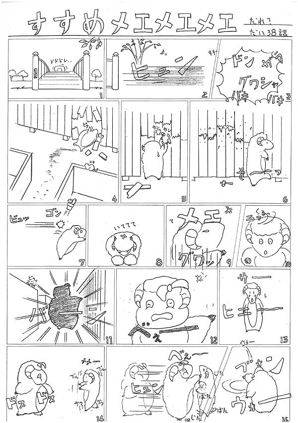『毎度お騒がせな登場のメエメエメエ。壊したものは直せばいいってもんではありませんよね。良い子のみんなはまねしないでね。ほらほらそういう事をするから、こんな怖いおばさん(えっ、リボンつけてるけどだわ?)につかまって、さらに投げられてしまって・・・すごいパワー。そういえば今年はオリンピックイヤーだね。』 byりゅうげん
