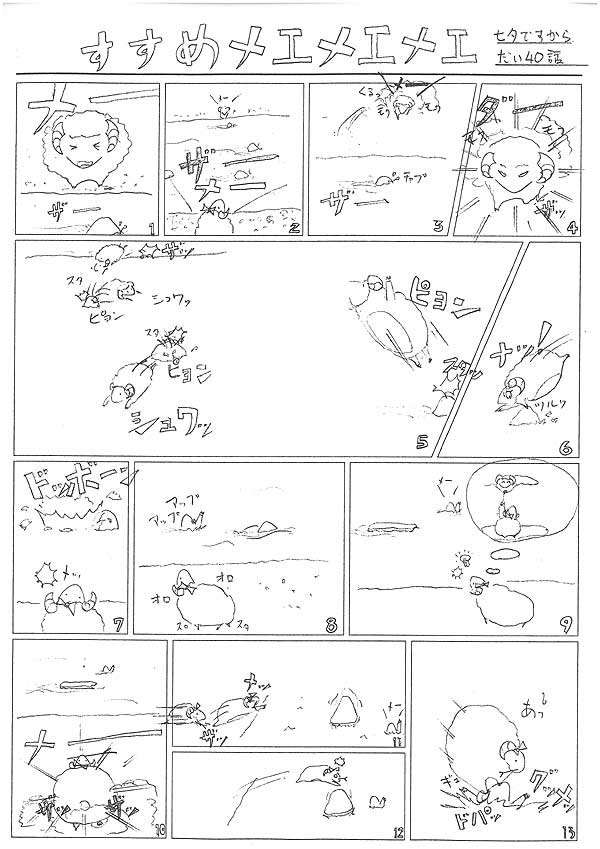 『七夕の日、川をはさんでお互いを呼び合うメエメエメエとリボンちゃん。意を決して岩飛びペンギンよろしく果敢に岩飛びにチャレンジ。そしてやっぱり、そういえば川でおぼれているメエメエメエを助けようとするシーン、以前にもあったような・・・と思ってみたら”第3話”にありました。当初からの読者はわかったかな?で、オチはよく見たら前話と同じでした・・・』 byりゅうげん