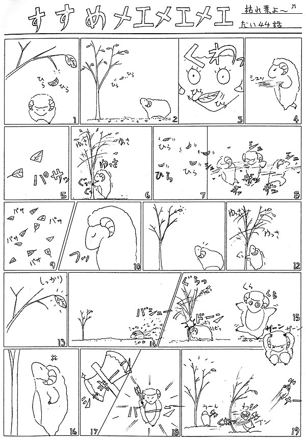 『ボクシングマンガではお決まりの、葉っぱを使ったシーン。へぇ、メエメエメエも葉っぱを切る技できるんだ。(メエメエメエはボクシングマンガではありません)でも、「1枚の葉っぱを笑うものは1枚の葉っぱで泣く」というとおり(そんなことわざはありません)1枚の葉っぱに振り回されて、飛んでいってしまいました。』 byりゅうげん
