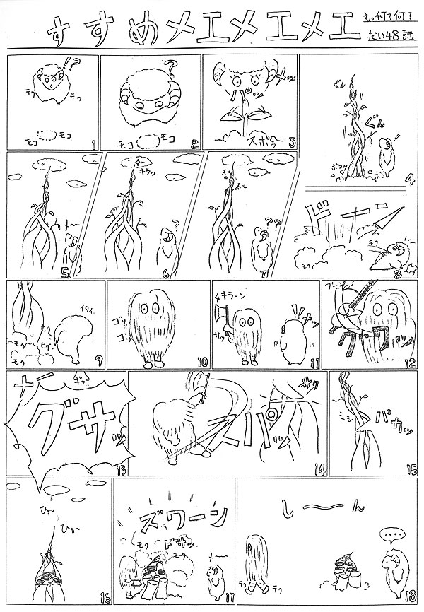「わっ!!びっくり、またストレートボブの”なまはげ”が出てきたのかと思っちゃいましたよ~。推測するに、季節を意識→ジャックと豆の木→大男は落ちてきたが話が落ちない→最後読者の皆様に丸投げした→う~ん♪シュール(笑) 『シュールとは:普通の理屈では説明が出来ないさま、難解で奇抜なさま、長現実を超えた状態・・・』そうか!これからシュールなマンガ”すすめメエメエメエ”って、サブタイトルつければいいんだ(^_^)v」 by小川