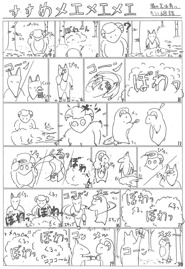 「先月号とまるっきり同じ登場の仕方のメエメエメエ。枯葉をおでこにつけて『ぼわっ』『簿わっ』と何回も何回もやってる内にどっちがどっちかわらなくなって、やたら楽しくなってしまったメエメエメエとコン吉♪という事で(笑)先月号は普通過ぎてシュール感に欠けてた!と、ファンの方よりシュールなご意見をいただき、がぜん張り切ってシュール感を出してみた、りゅうげん先生でした~(^_^;)」 by小川