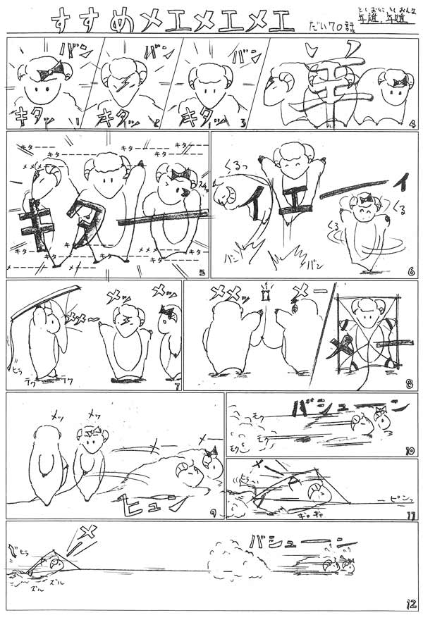 「去年りゅうげん先生の先輩がメエメエメエを読んで、「こういうの掲載してくれるって懐(ふところ)の深い会社だね♪」と。(笑)いやいや、まだまだ懐の余裕ありますから。今年も”シュール感満載”で、せんせ!お願いしますよ。 きゃ~、ほんとに『きた~!きた~!きた~!』、とうとうメエメエメエの年がやってきましたね~。「りぼんちゃん」「いなずま君」も久々の登場で♪