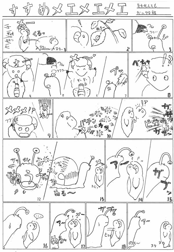 『心ほっこり100号で集合した仲間?達と別れ、またいつもの旅が始まった。メエメエメエはカタツムリの唾液で角が小さくなってしまったが、アフリカマイマイというカタツムリに寄生している寄生虫が人間の体内に入ってしまうと、最悪死に至るケースがあるから、絶対に触ってはダメだ!と息子が教えてくれた。』 byりゅうげん