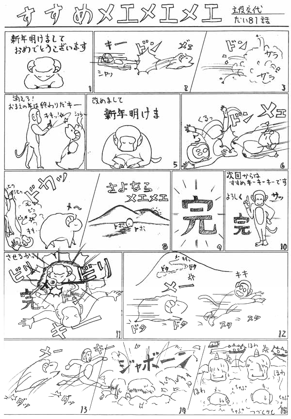 「「すすめメエメエメエ」の読者の皆様、あけましておめでとうございます。「すすめ キーキーキー」には吹き出してしまいましたよ(笑)・・ということは、来年は「すすめコケッコケッコケッ」?その次は、「すすめブギッ・・・」あ~猪の鳴き声って?”フギッ””ブボッ”・・・(^_^;)いやいや、そんな事よりせんせ メエメエメエでないと。ねっ♪皆様そうですよねっ♪ 」 by小川