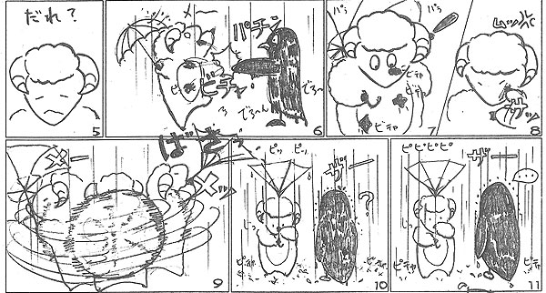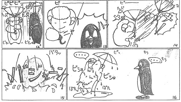 「ペンペン、どしゃぶりの雨の日でもいつもと同じ陽気な 「ヨッ」 の登場で、憂鬱な梅雨が少しだけテンション上って楽しくなりましたよ♪ それにしても、せんせ、傘が「おちょこ」になる・・・なんか昭和の香りがぷんぷんする言葉なんですけど~もう死語かもしれませんよ、「傘がおちょこになる」って(笑)もしかして、せんせ、タ-トルネックのセータ-も、「とっくりのセ-タ-」って言ってませんか?そしてマフラ-は「えりまき」? きゃははは~だめだめ!このての話は、始めるといつも止まらなくなっちゃいますから~(^_^;) 」 by小川
