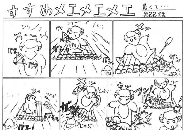 「先日、りゅうげん先生が、「駿東郡小山町の“どんぶらこ祭り”に行ってきてね~来年は参加しようかな~・・・」と楽しそうに話してるのを聞いていて・・・(今度のメェメェメェは、絶対に“どんぶらこ”だな!間違いない!)と私は心の中でつぶやきました。やっぱりね!やっぱりね! (笑) 最後のコマにいる「イカ」を見て、何でペンペンでなくイカなの?と聞いたら、「だって、メェメェメェが乗ってるの“いかだ”だもん」と・・・・・・はいっ! おつかれさまでした~。 」 by小川