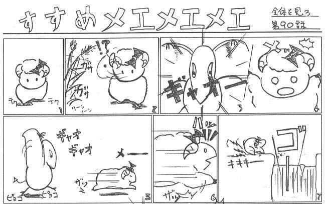 『ある一部だけしか見てなくて失敗する事ってありますよね。将棋で散々考えて動かしたコマを簡単に取られてしまったり、“木を見て森を見ず”というか・・・今回はそんな話です。今月で90話を迎える事が出来ました。このままいくと、来年は「第100話」となってしまいます。これもひとえに熱烈な読者のおかげです。40年続いた「こち亀」も終わってしまいました。残念です。メェメェメェはいつまで続くのでしょうかね。』 byりゅうげん