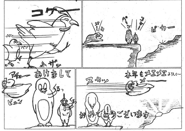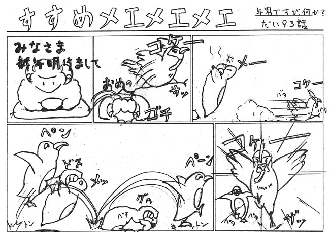 ではここで5秒間「すすめメェメェメェ」見て裏返してください。さて問題です。“コケ-”と「丹羽とり也」は何回言ったでしょうか~?2017年酉年の元旦にデビュ-しました、「丹羽とり也」です。(ラインスタンプの作者:にわ とり男先生を完全にパクリました)最初、ペンペンと丹羽とり也の大きさの関係がよくわからず、うわっ!!大きなニワトリ!と思ったら、後半のコマで「丹羽とり也」が思いの他小さい事がわかりました~(笑)