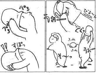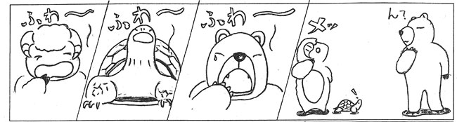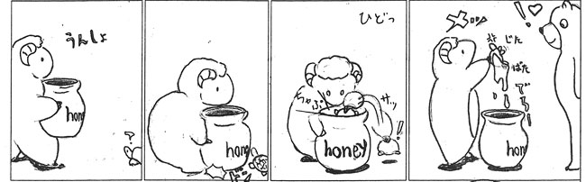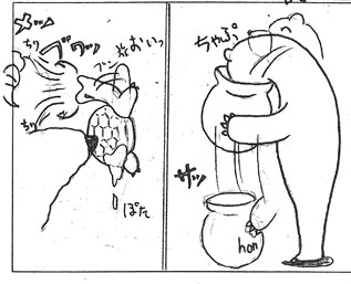 「36話!探して読みましたよ~。その時のカメはいつもびくびくしていたので、名前を「びく君」とつけていました。メェメェメェ!ひど~い、そりゃビク君だって怒るよ~(汗)36話って事は、あれから5年も経っている~、何かびく君たくましくなってる?火も吹いちゃうし(笑)そう言えばディズニ-のクマのプ-サンも、いつもはちみつ壺に頭つっこんでました。今回のくまちゃんは、お腹が空いてぐぅ~ぐぅ~鳴ってるから・・・名前は“クマのぐぅ~さん”にしよっと。」 by小川