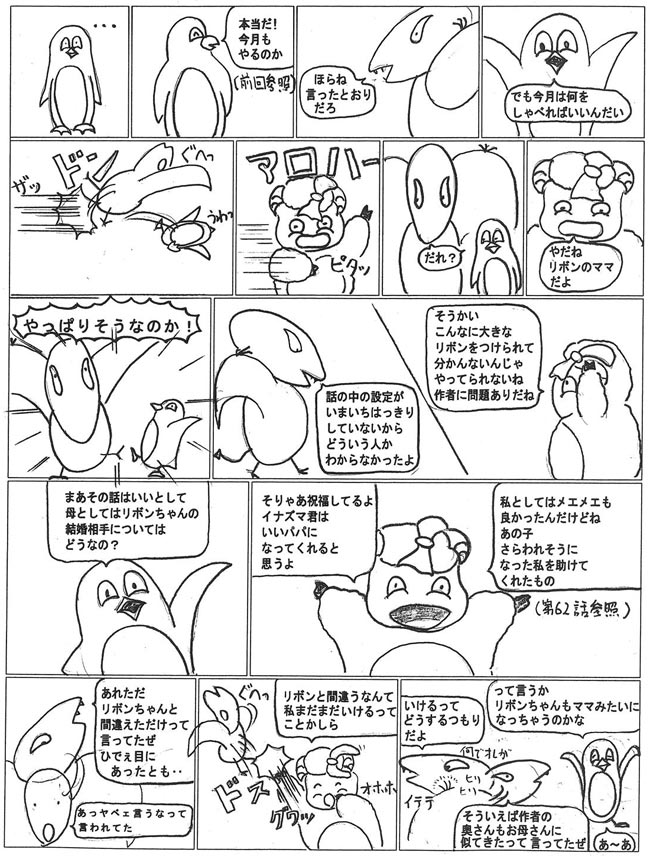 「私が番外編<1>と書いてしまったので、りゅうげん先生「番外編<2>」を、忙しい中描いてくれました。メエメエメエ番外編ファンの方!やりましたね~でも、これがホントのホントの最後だそうです。ガックン・・・でも、でもここだけの話、今せんせ♪新企画を考えてくれてるようです~パチパチパチ。含み笑いに乞うご期待♪」 by小川