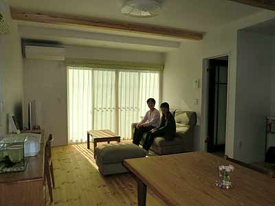 広々リビングは、集成材の化粧梁を表わし、天井高を上げています。パイン材無垢フロアーなので裸足が気持ちいい♪二人でゆったりとした時間を過ごされているそうです。 |