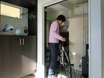 | ご主人様の趣味である自転車と釣り竿を収納する土間スペースです。 |