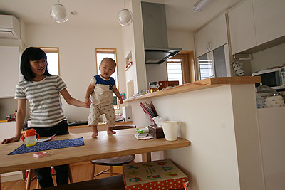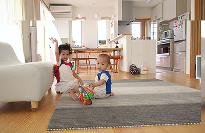 | LDKは南に面して床までの大きな窓が並んでいます。明るくて風通しも良いので、ここで子供達はよく遊んでいます。ただ、物を置いたり飾ったりする壁が少なくて、それが悩みどころです。 |
