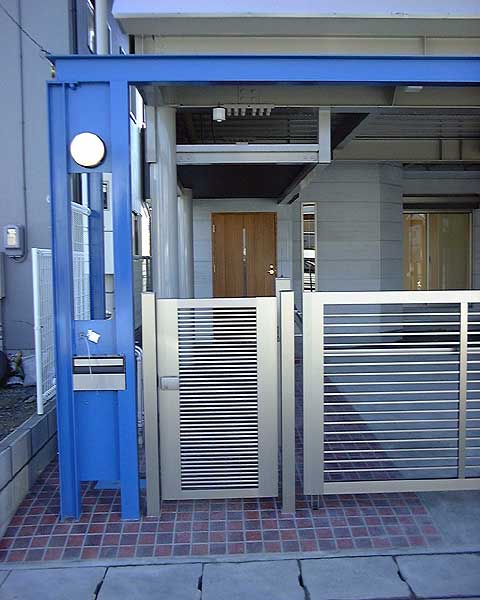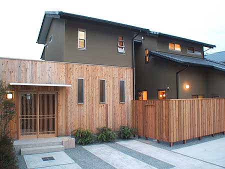 建物外壁と一体化した板塀と玄関へのくづり戸がアクセントになっています。 駐車場も植木や砂利敷きで和風を演出しています。