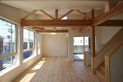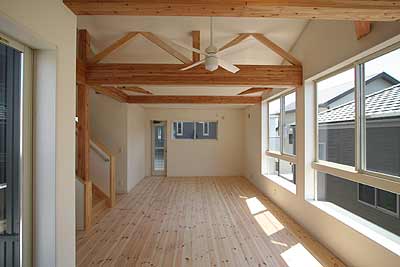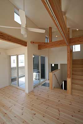勾配天井に一部構造材を表しにして、パイル床材を一面に敷き、