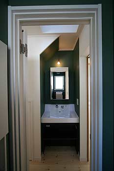 | グリーンの壁が印象的な1階トイレと洗面所 |