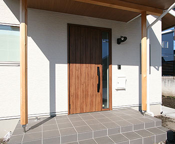 玄関ポーチ柱には無垢材を使用して、和テイストに仕上げました。数年すると飴色に経年変化して風合いが出てくると思います。