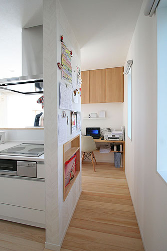 アイランド型キッチンの裏にはマグネット可能なパネルとマガジンラック。奥には造作カウンターでパソコンコーナーをつくりました。