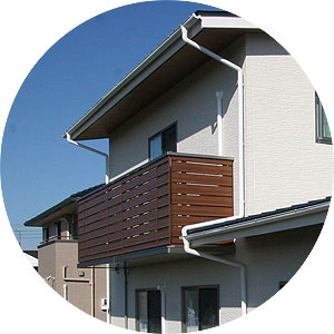 | 光触媒で美しさが長持ちする白い外壁サイディングと、木目調格子がアクセントになったアルミ製オーバーハングバルコニー。 |