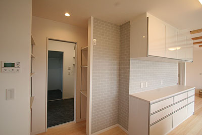キッチン後方には、収納カウンターと食品庫をつくりました。