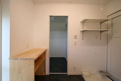 | 洗濯室には一時置きの物干しフックや棚類を付けて、奥様が家事をしやすいように工夫されています。 |