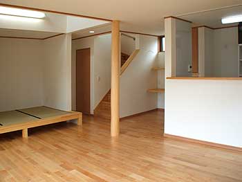 広々したLDK。入口付近にある丸太柱もアクセントになっています。