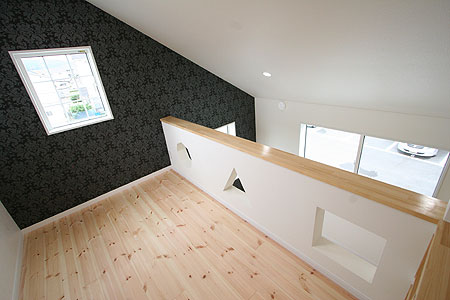 子供部屋のロフトの壁は、四角・三角・八角形でくり抜かれています。