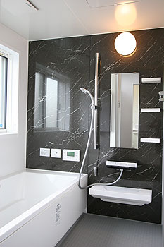 | 白×黒ですっきりとしたバスルーム。浴槽にはマイクロバブルもついています。 |