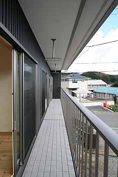 | 片流れ屋根の軒の出が夏の日差しをカットします。シンプルな格子手摺は、風と太陽光を最大限取り込みます。 |