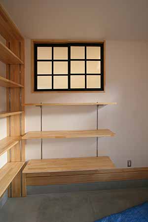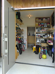 | バイクいじりのスペースは、棚などの収納スペースを目いっぱい設置しました。 |