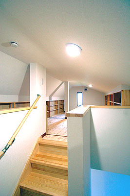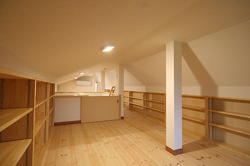 小屋裏スペースは奥様の趣味のスペース。固定式階段の降り口には低いタイプの戸が付いていて、夏場の冷房効率を高めます。