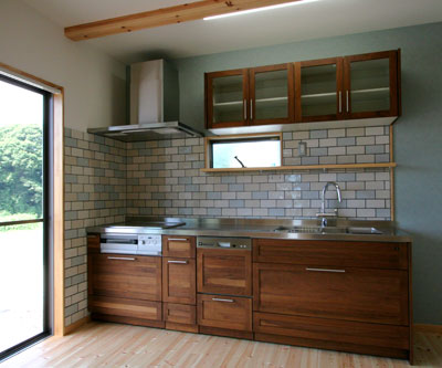 ウォールナット無垢扉のキッチン。壁のタイルもじっくり悩んで選びました。