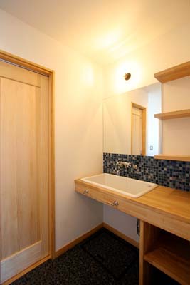 オリジナルの造作洗面。壁のモザイクタイルもこだわりが。