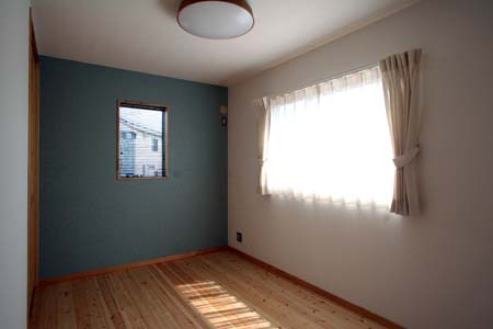 子供部屋、建物のテーマカラー「モスグリーン」を一面の壁に使っています。